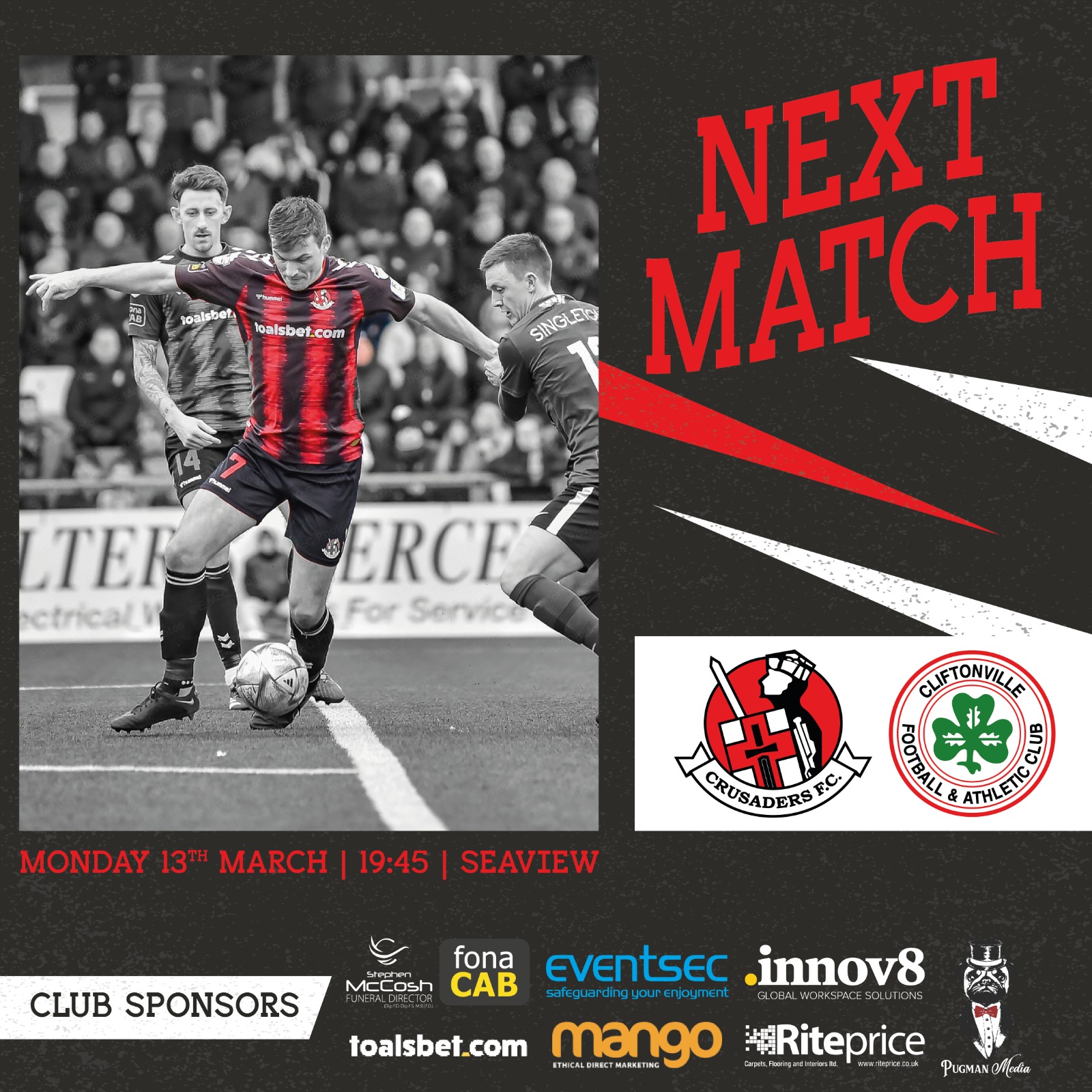 Next up for Crusaders is the visit to Seaview of North Belfast rivals Cliftonville on Monday 13th (7.45pm) in another massive Danske Bank Premiership...