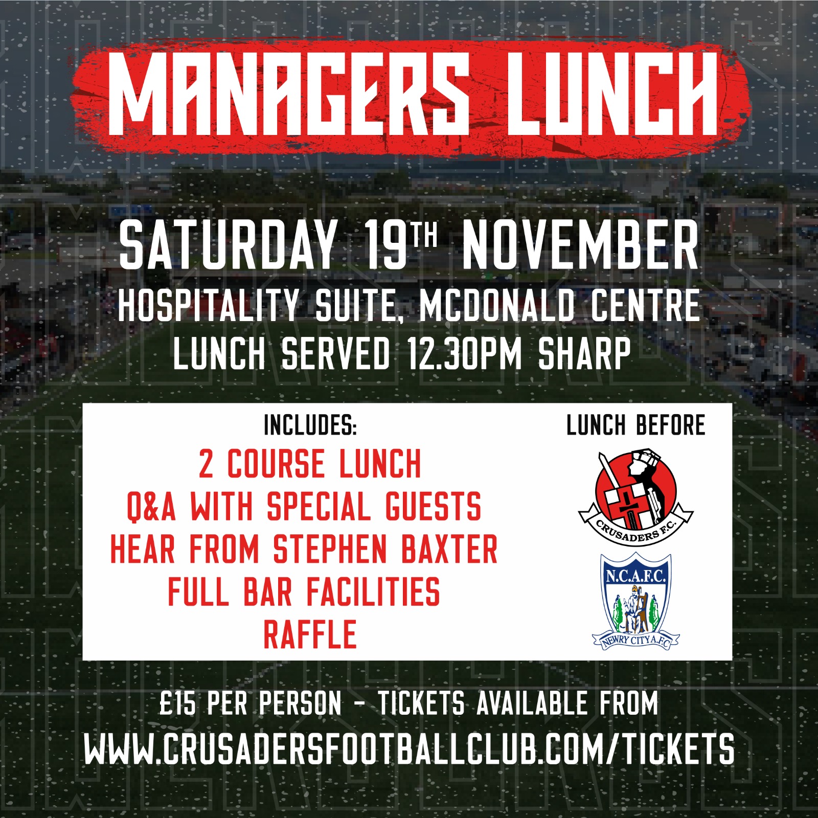 The Club are having a Managers lunch on Saturday 19th November prior to the game against Newry City and it would be great to have you there.A 2 course...