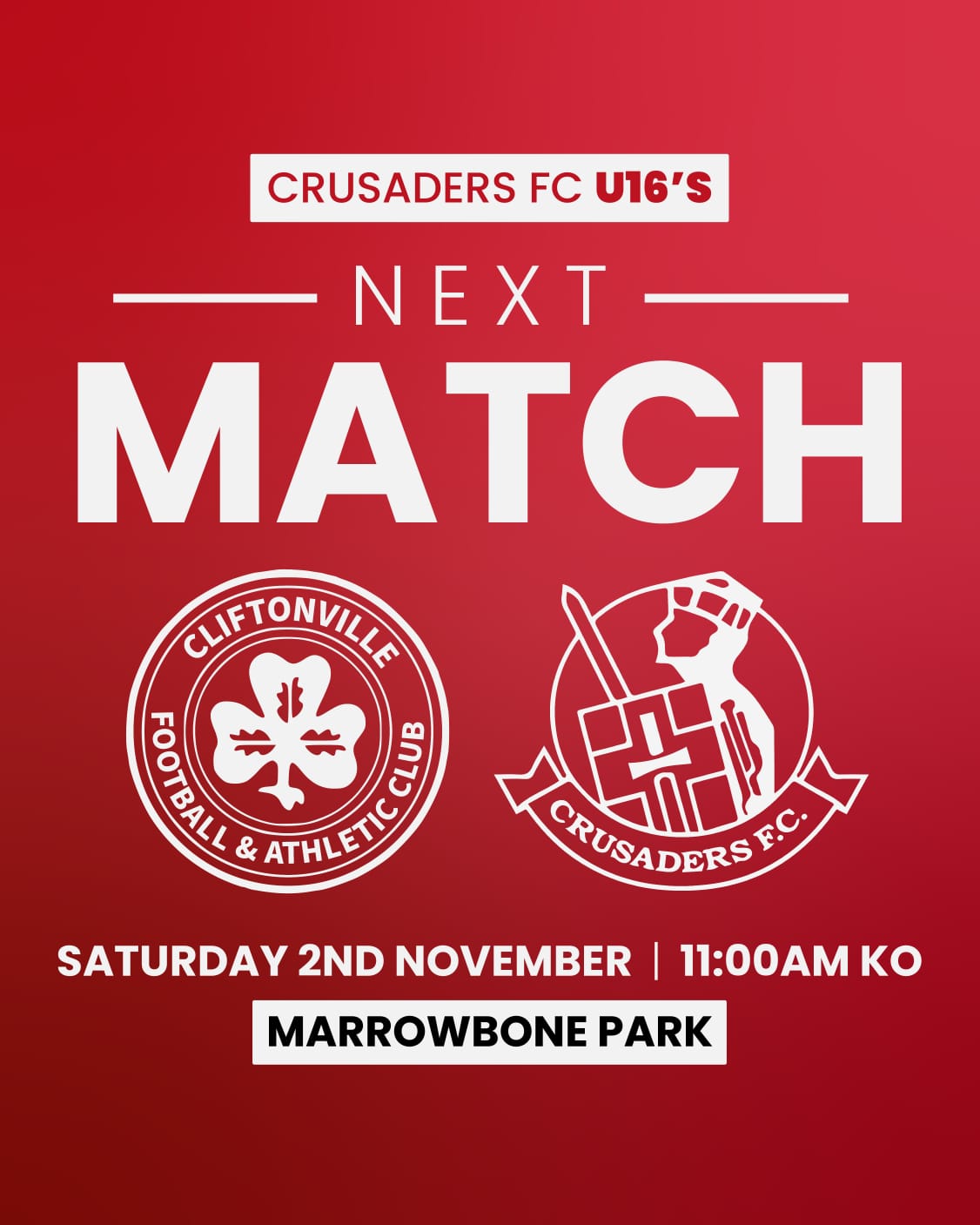 Crusaders U16's get back at it this Saturday morning, 2nd November, when they play Cliftonville U16's in their latest NIFL Academy League game. T...