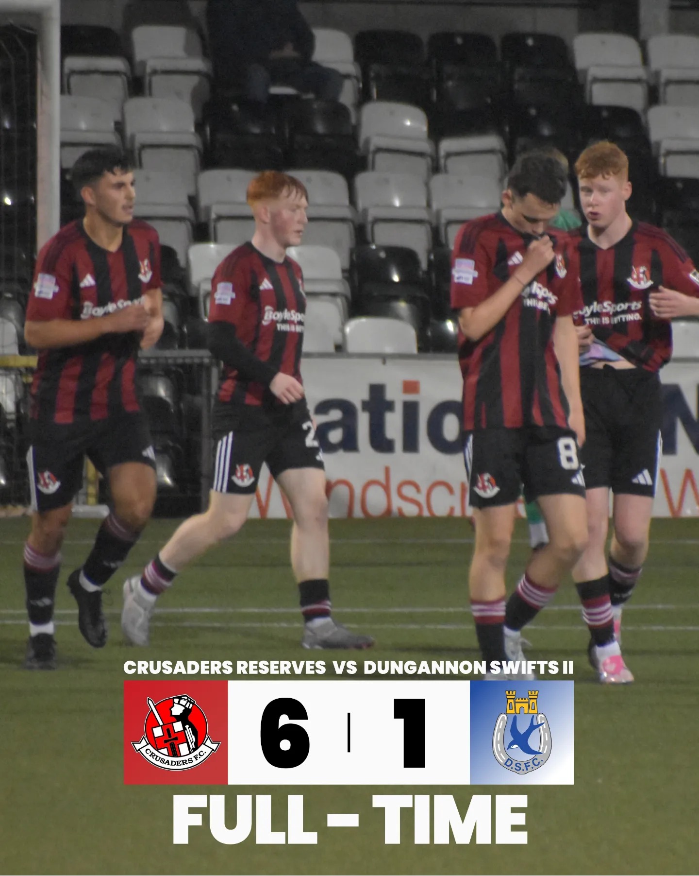 Crusaders Reserves moved back to the top of the Premiership Development League with a big 6-1 win over Dungannon Swifts Reserves at Seaview tonight.Go...