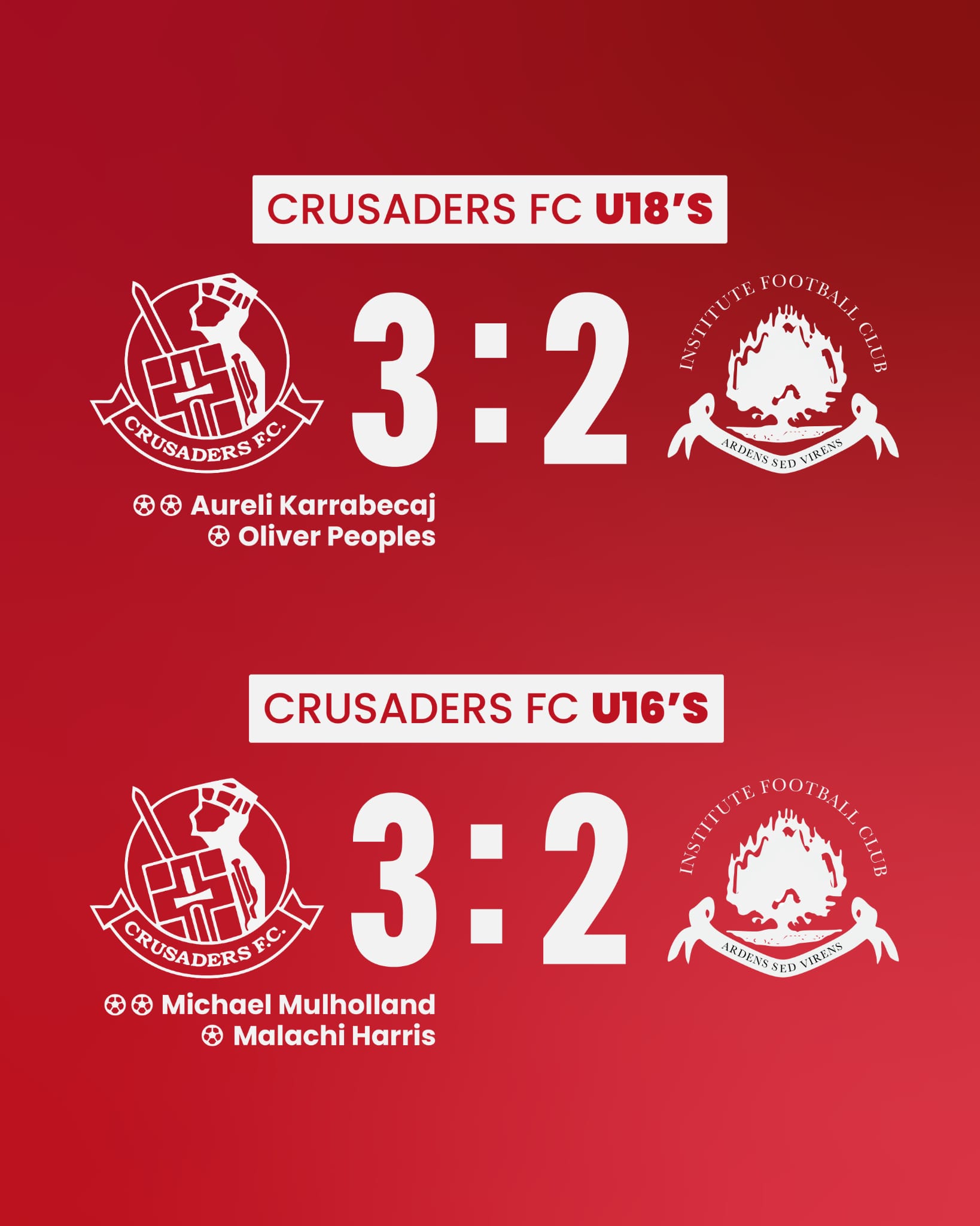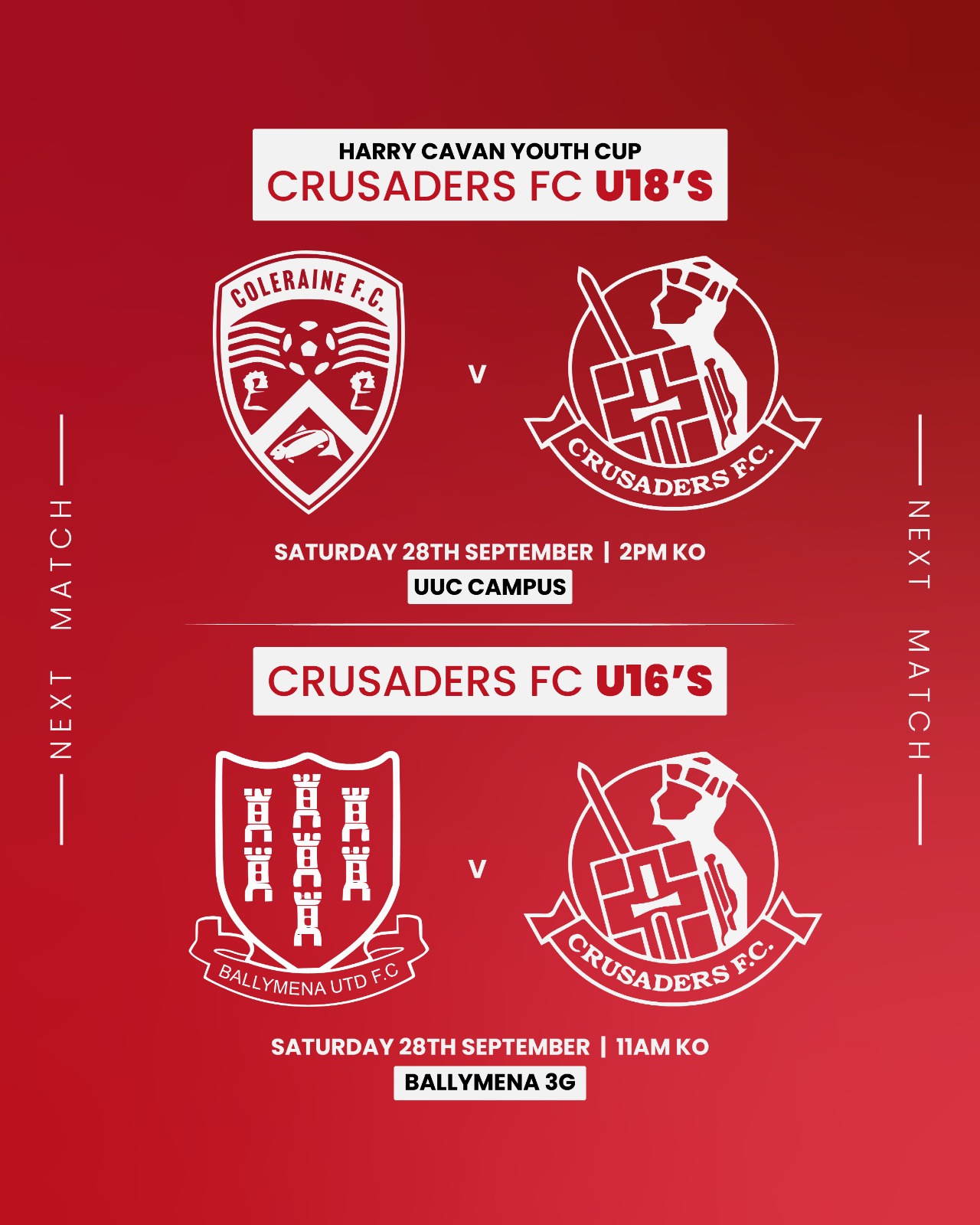 Crusaders U18's and U16's are both in action this Saturday (28th)Crusaders U18's travel to play Coleraine U18's in the Harry Cavan Youth Cup leaving t...