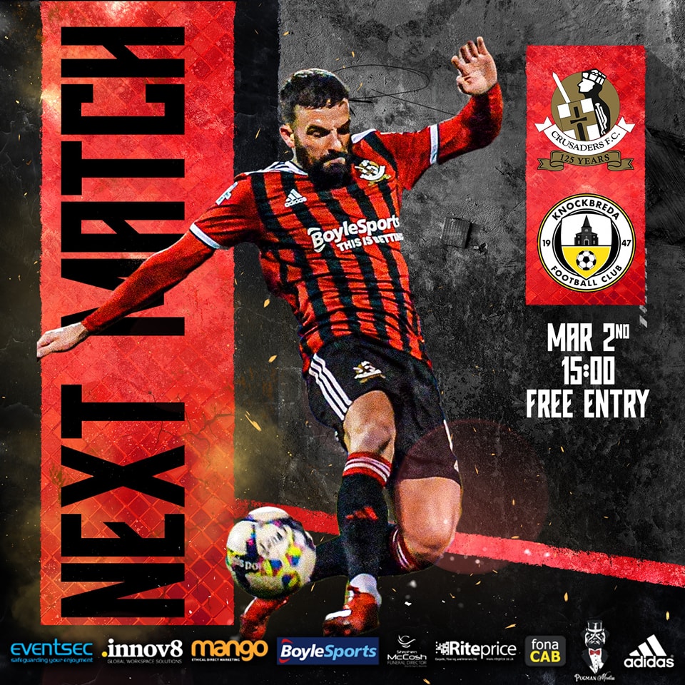 Crusaders will play Knockbreda this Saturday (2nd March ) in a friendly at Seaview. The game has a 3pm kick off and entry is FREE.Why not make a day o...