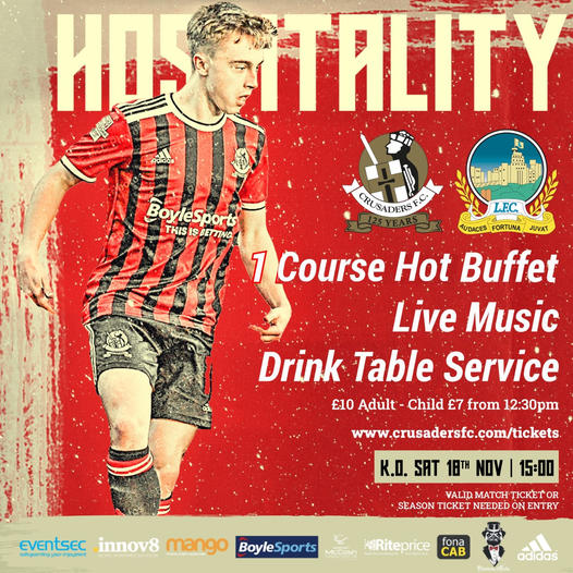 Tickets are live for our pre-match hospitality next Saturday 18th against Linfield.We have a 1 course hot fork buffet, live music pre-match and drinks...
